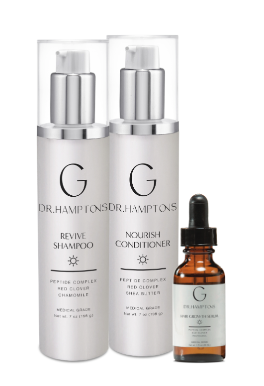 - Dr. Hamptons Revive Shampoo: Enriched with Peptide Complex, Red Clove, and Chamomile, this shampoo stimulates hair follicles, improves circulation to the scalp, and promotes a healthier environment for hair growth. It cleanses, nourishes, and strengthens, leaving hair feeling soft, revitalized, and full of life.